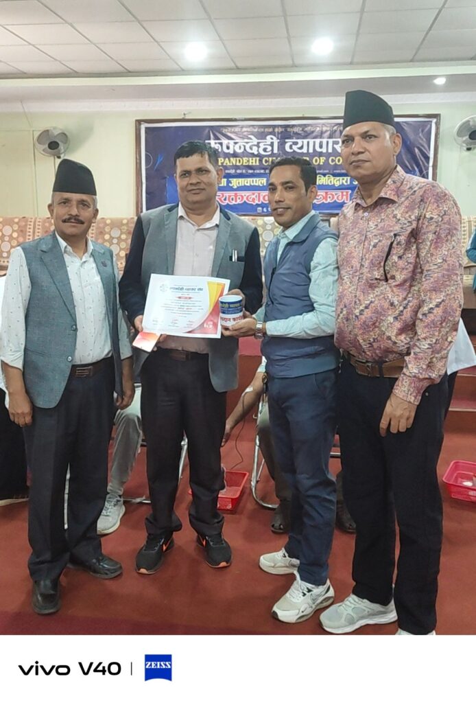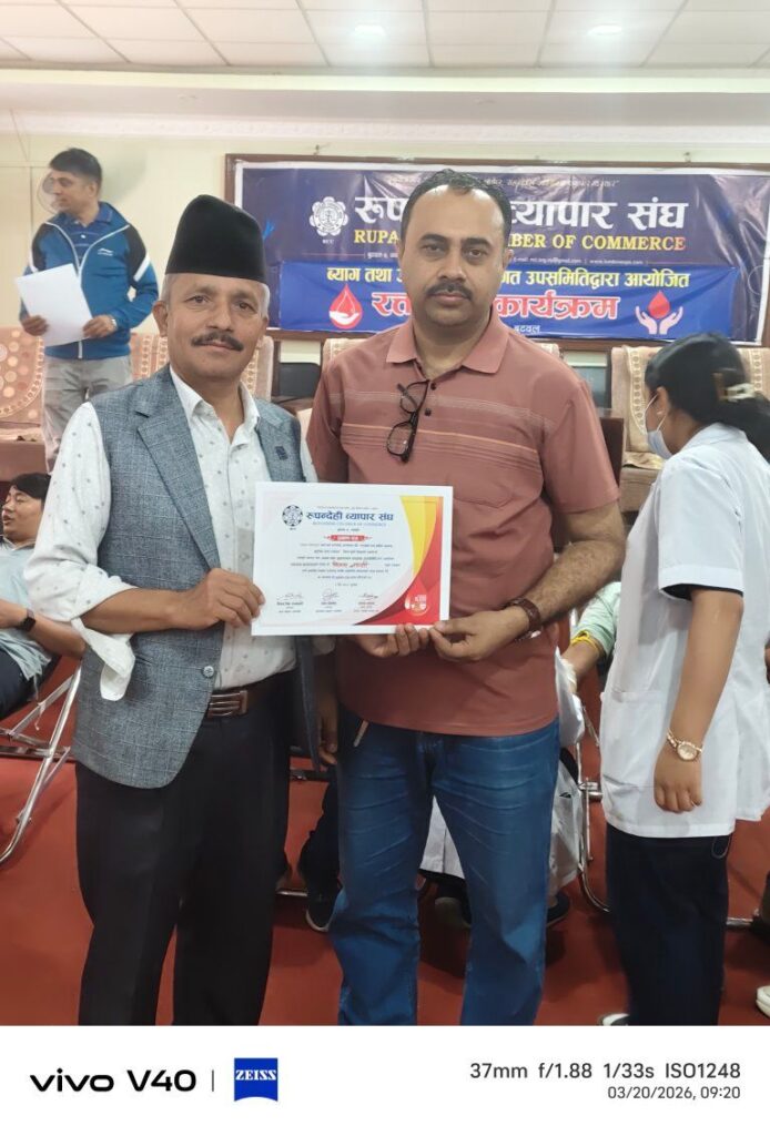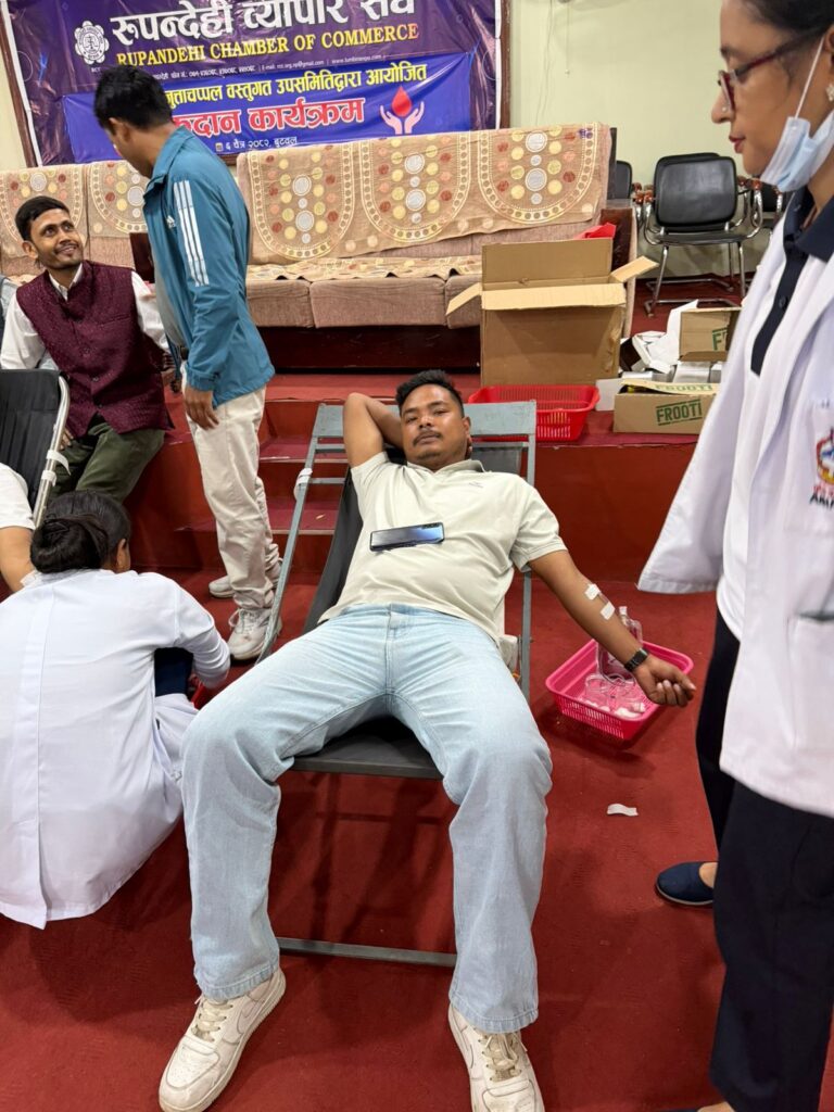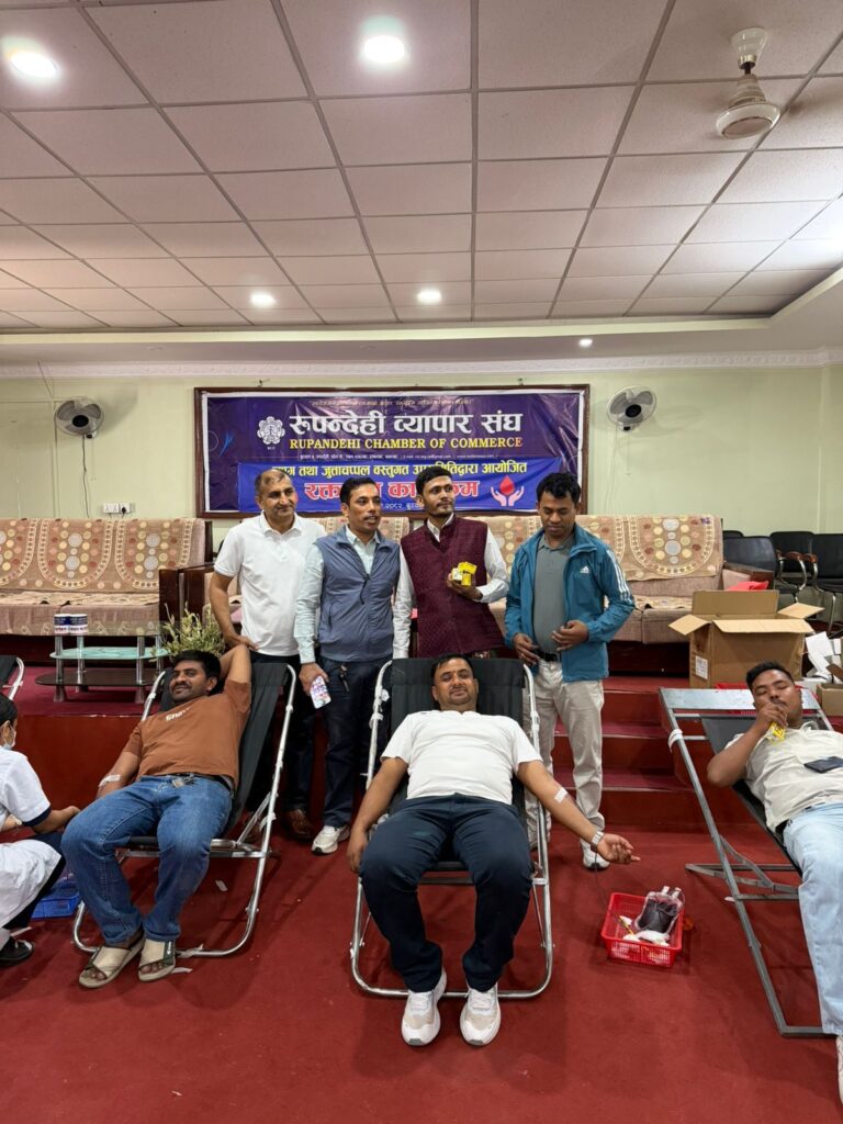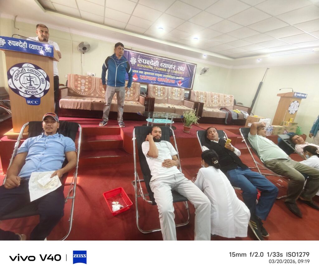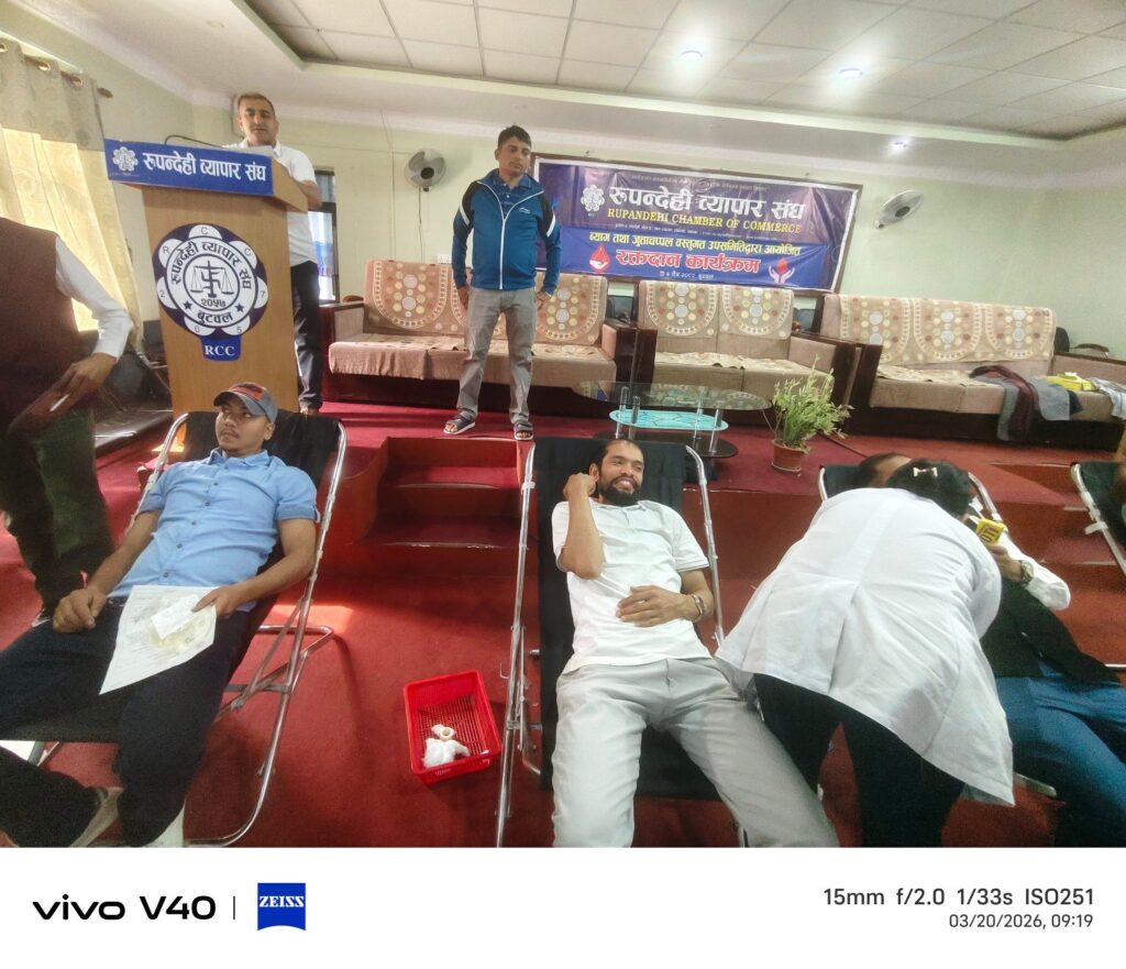 बुटवल, ६ चैत्र । रुपन्देही व्यापार संघअन्र्तगत व्याग तथा जुत्ताचप्पल वस्तुगत उपसमितिद्वारा विश्व खुसी दिवसको अवसरमा रक्तदान कार्यक्रम सम्पन्न गरेको छ । लुम्बिनी प्रादेशिक अस्पताल बुटवलको प्राविधिक सहयोगमा संघको सचिवालयमा आयोजित कार्यक्रममा ५१ युनिट रगत संकलन भएको व्याग तथा जुत्ताचप्पल वस्तुगत उपसमितिका संयोजक उत्तम देवकोटाले बताउनुभयो ।
